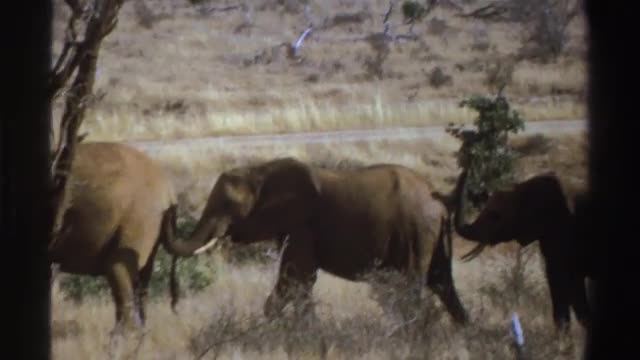> 1969: four elephants walking in line while holding each others tails SOUTH AFRICA