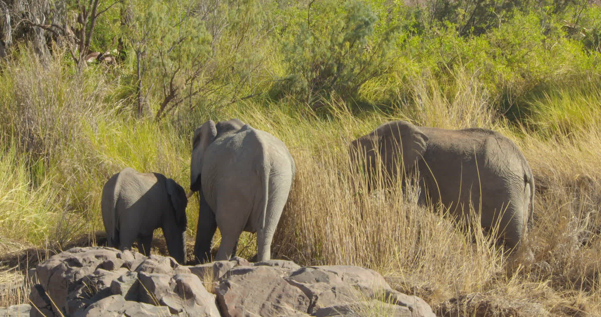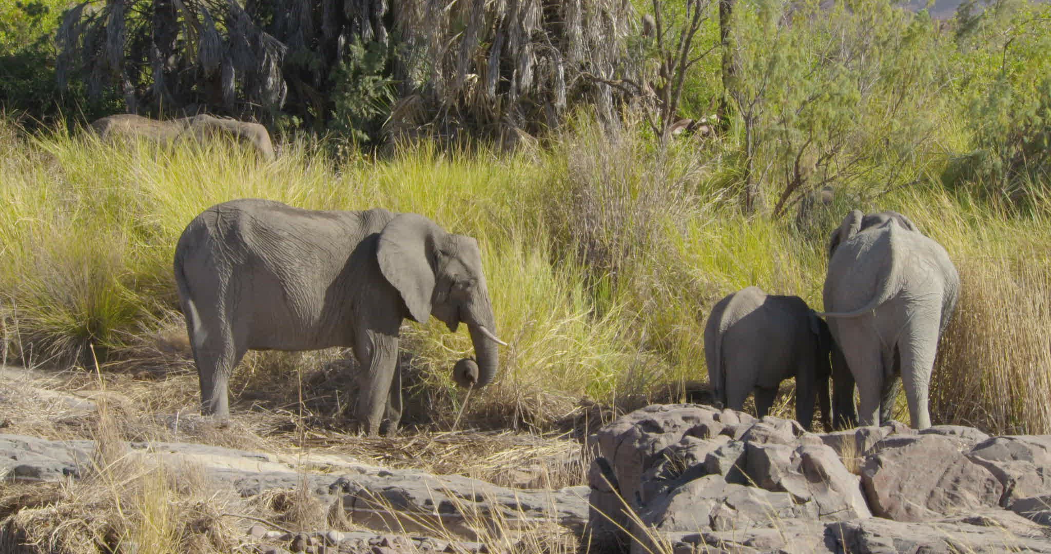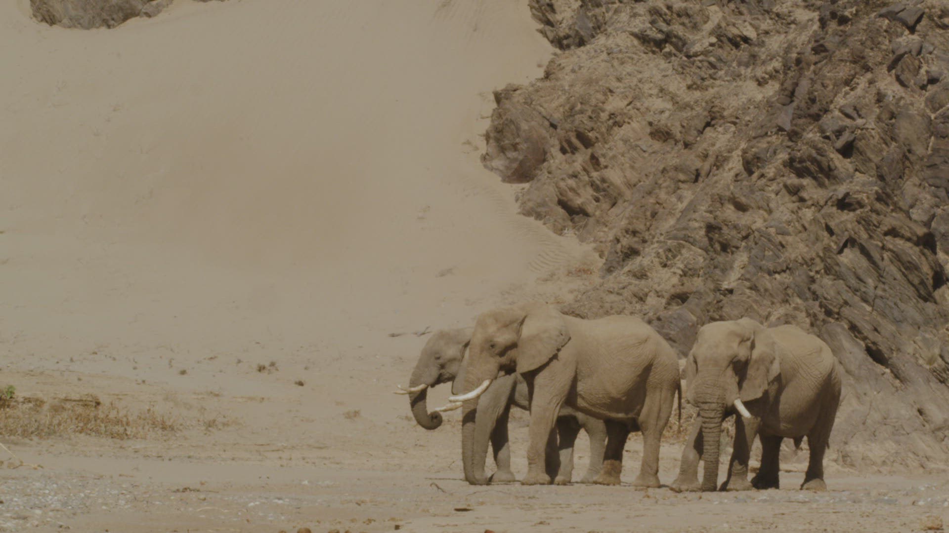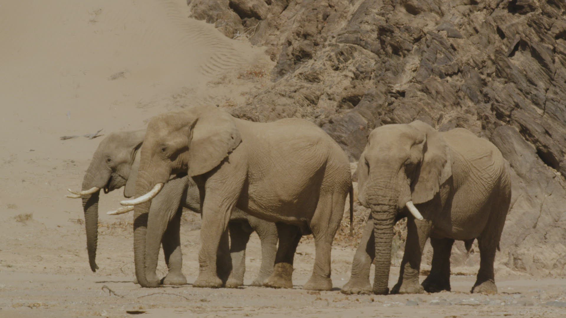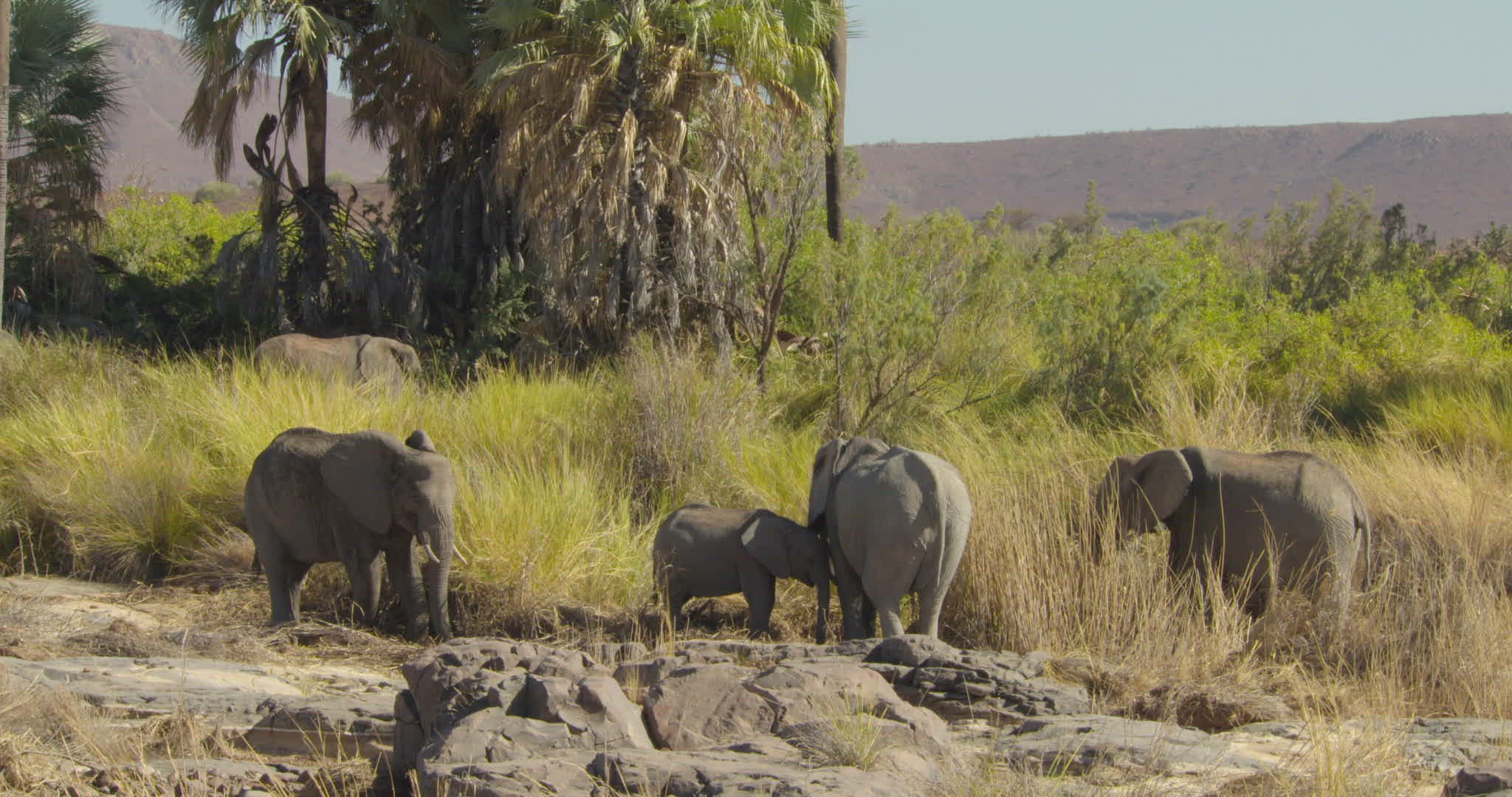 > 1969: group of elephants standing still on an arid landscape with a blue sky background SOUTH AFRICA
