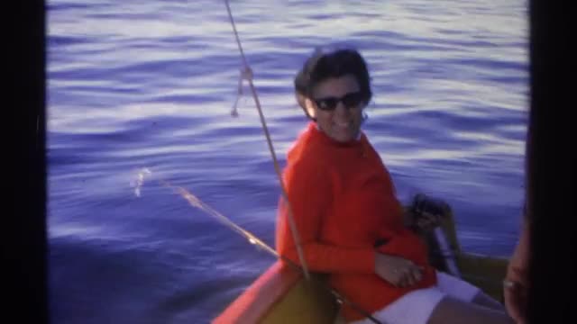 > 1969: a man in a fishing boat, smiling and talking to a lady and looking at silver bass freshly caug