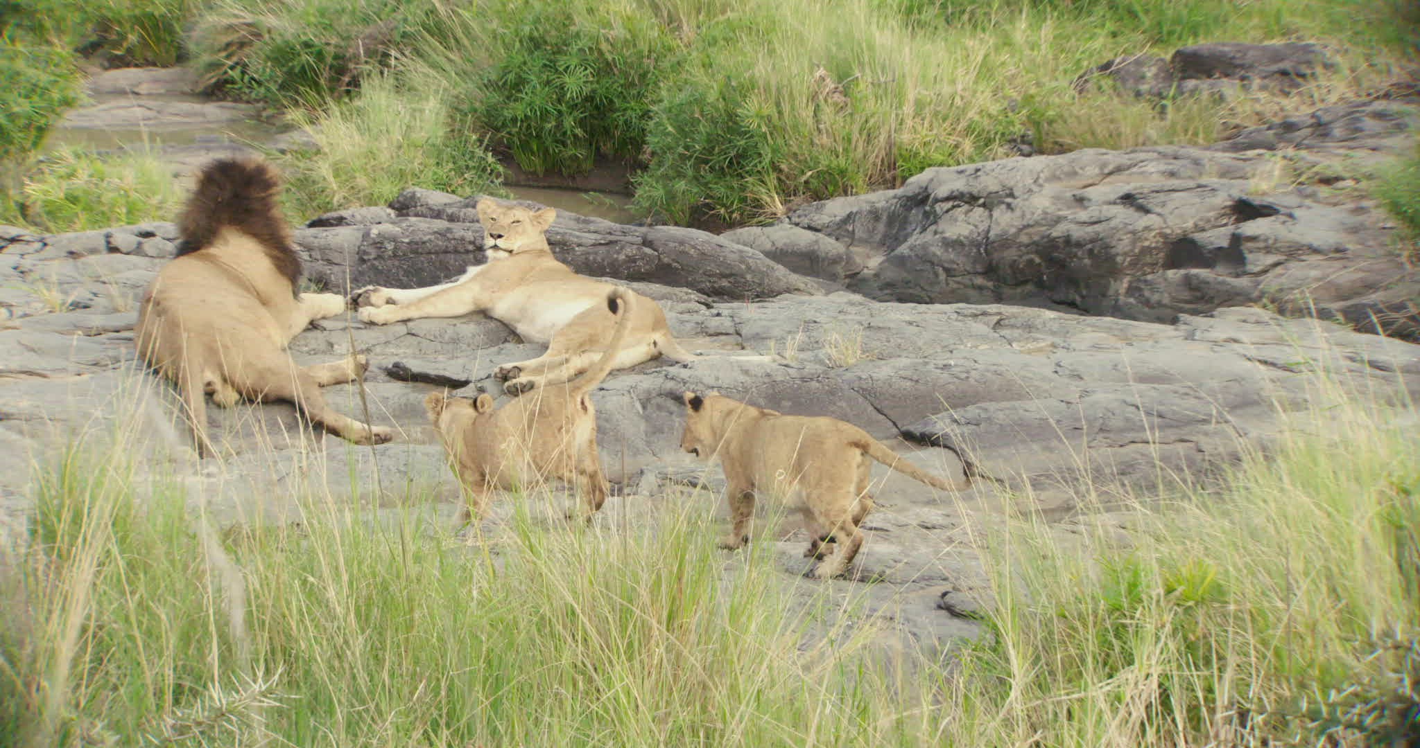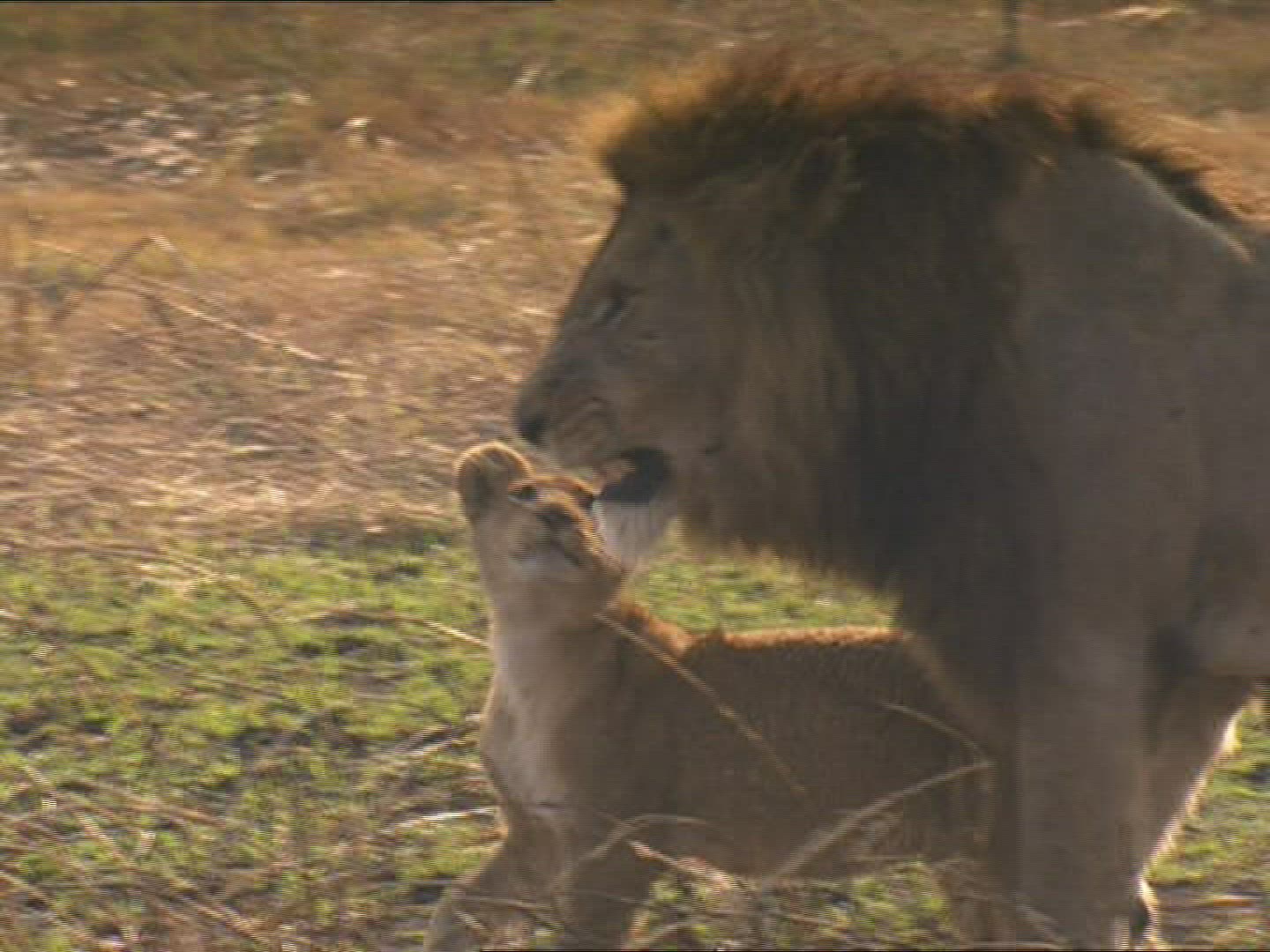 > 1969: a lioness smells a male lion while four cubs watch from the grass NIGERIA