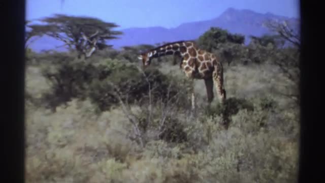 > 1969: a giraffe munches on a bountiful green bush. SUDAN