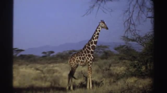> 1969: giraffe flicks its tail while standing still in a shrubby field SUDAN
