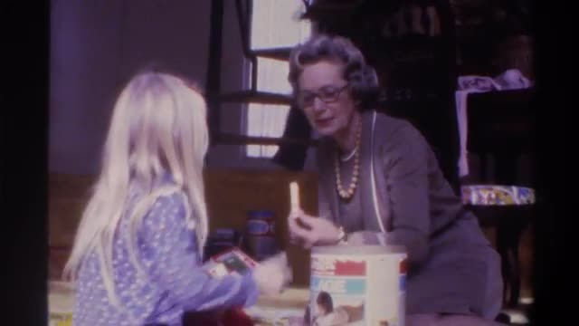 1975: woman and child taking pieces out of a container, looking at the pieces and putting it on the