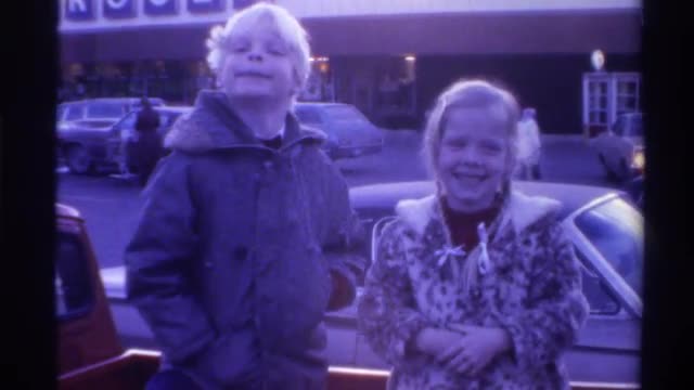 > 1975: man clears papers off table, followed by view of two children, the second one smiling awkwardl