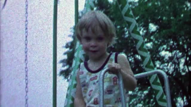 > 1974: blonde boy climbing on a swingset and posing for the camera FLORIDA