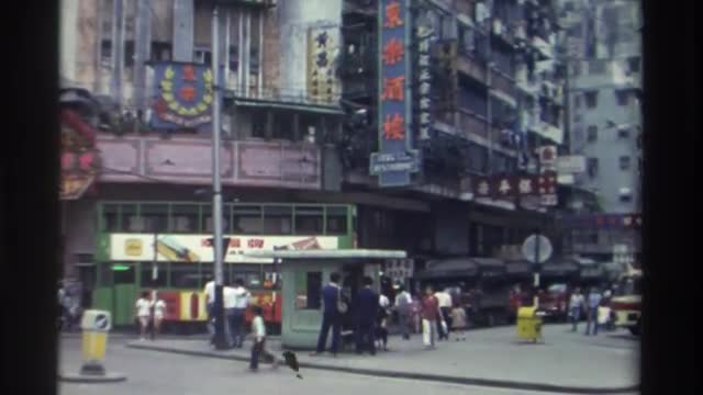 > 1982: double deck bus moving through the street in the city HONG KONG