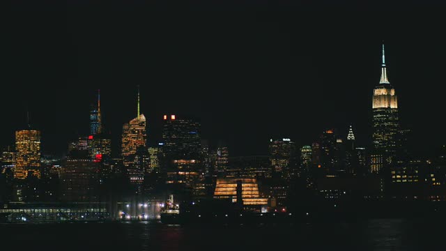 Downtown aerial of the night lights with the tower bridge lights on and traffic passing through the town.