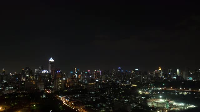 Timelapse shot of blinking windows and city lights of high-rise buildings in night Bangkok, Thailand