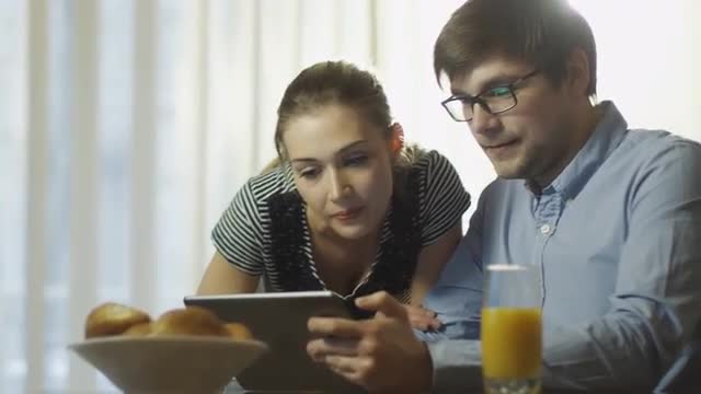 Back side view of young couple sitting on bench on beach on sea skyline background and watching something in tablet computer while man fishing at stone pear. Piraeus, Greece