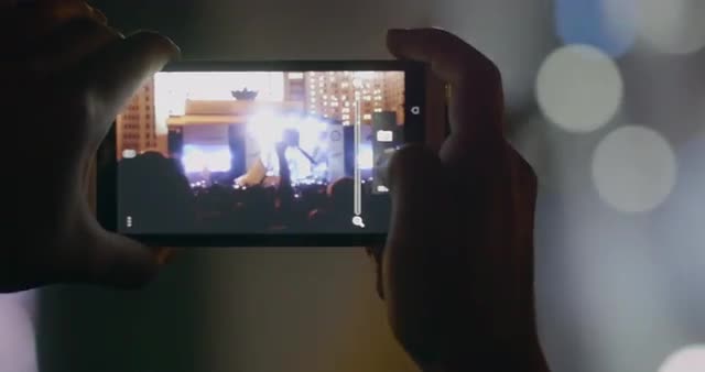 Hand of rock fan showing devil horn gesture against blurred stage spotlights