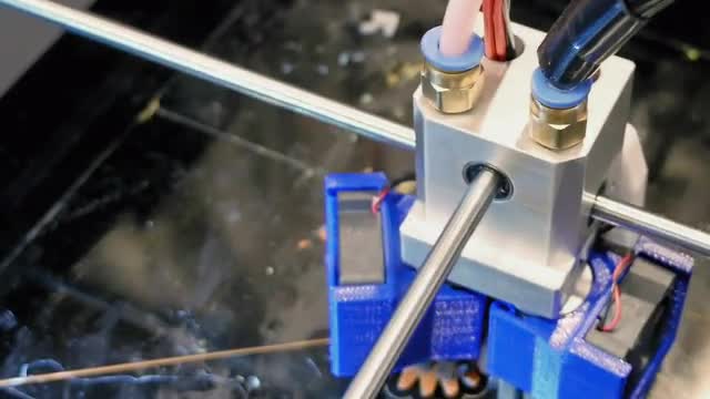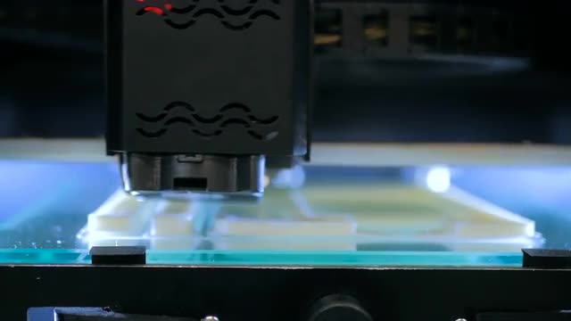 Close-up shot of 3D printer making an object from light green plastic. This technology allows to create repair pieces for equipment