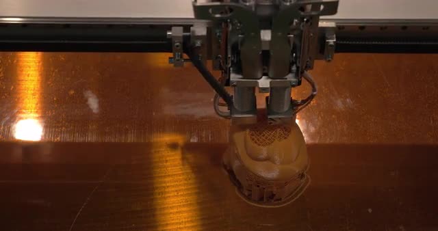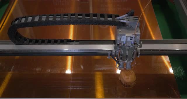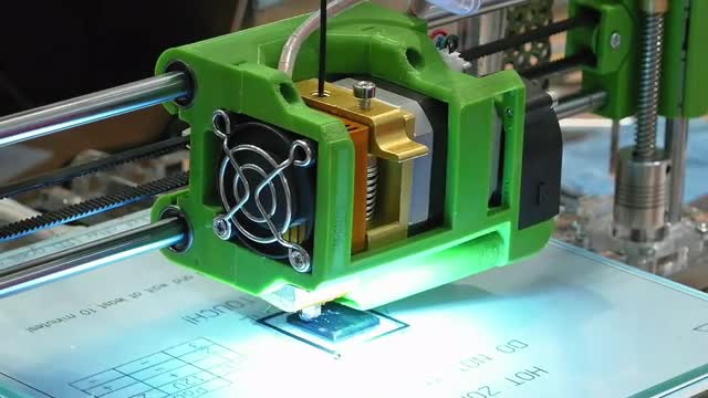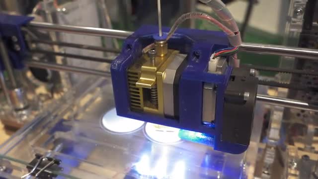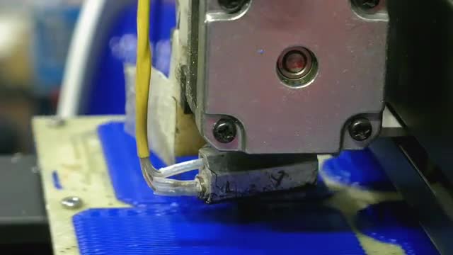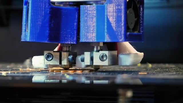 Close-up shot of 3D printer head working and making an object from white plastic filament