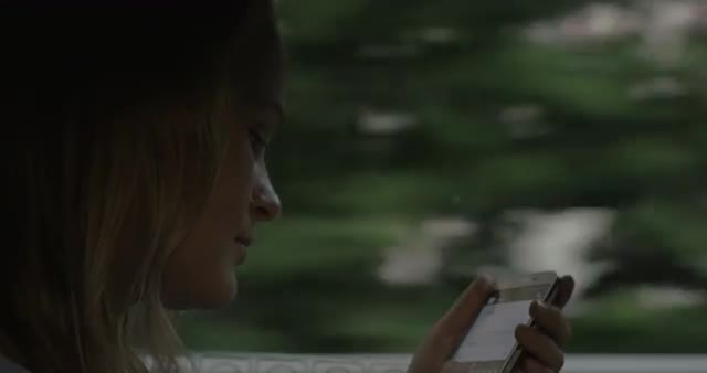Close-up shot of a young woman riding in the bus through Bangkok, Thailand. She typing sms on mobile phone while traveling