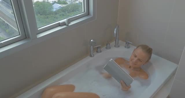 Happy young woman having a bath and surfing the internet on digital tablet by the window with view to the Bangkok, Thailand