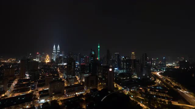 Tilt shot of train moving across the city and Kuala Lumpur panorama with high-rise architecture, Malaysia
