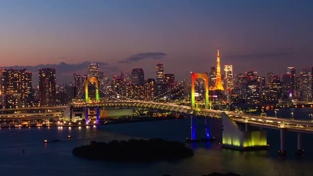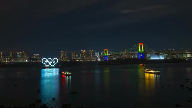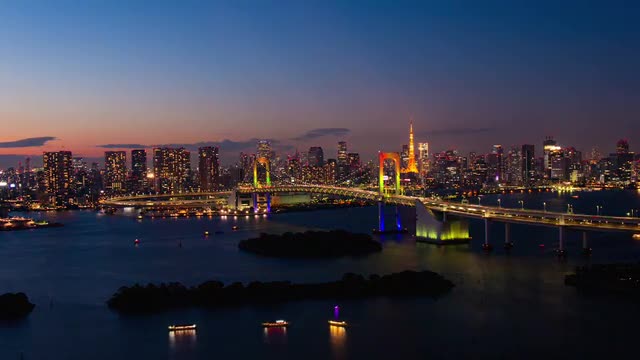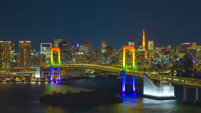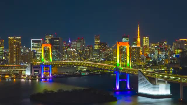 Time-lapse footage of Rainbow bridge at night, Tokyo, Japan
