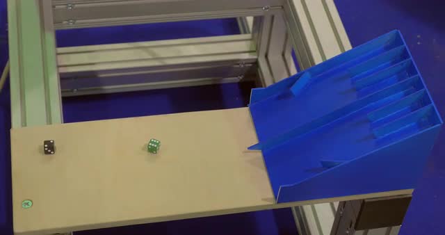 Robot performing playing dice. It takes cubes and putting in on inclined board