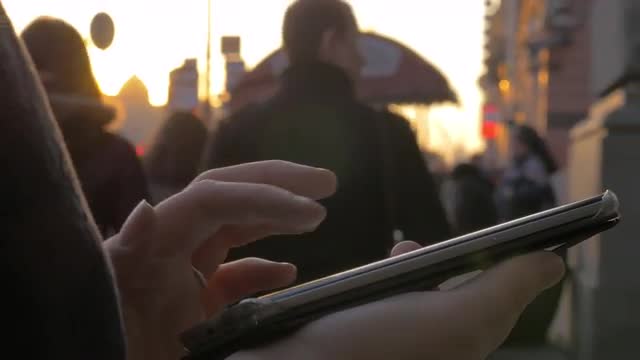 On night street a girl working on mobile phone. In the background seen night city lights and passing cars