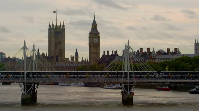 View from the window of a moving train seen trees, buildings, bridges and railroad