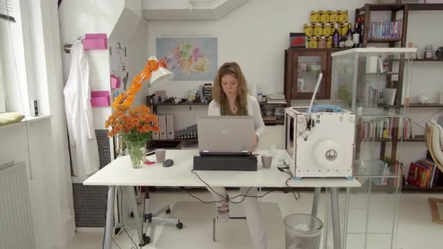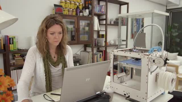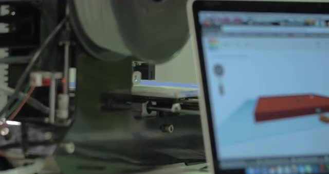 MOSCOW, RUSSIA - NOVEMBER 21, 2015: Laptop screen displaying the three-dimensional model with following focus on working 3D printer at Robotics Expo