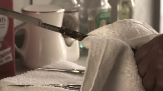 > Senior man shaving another man by old blade, traditional haircut