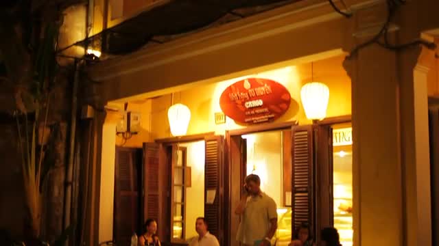 > People having food and drinks in roadside cafe. Hanoi, Vietnam