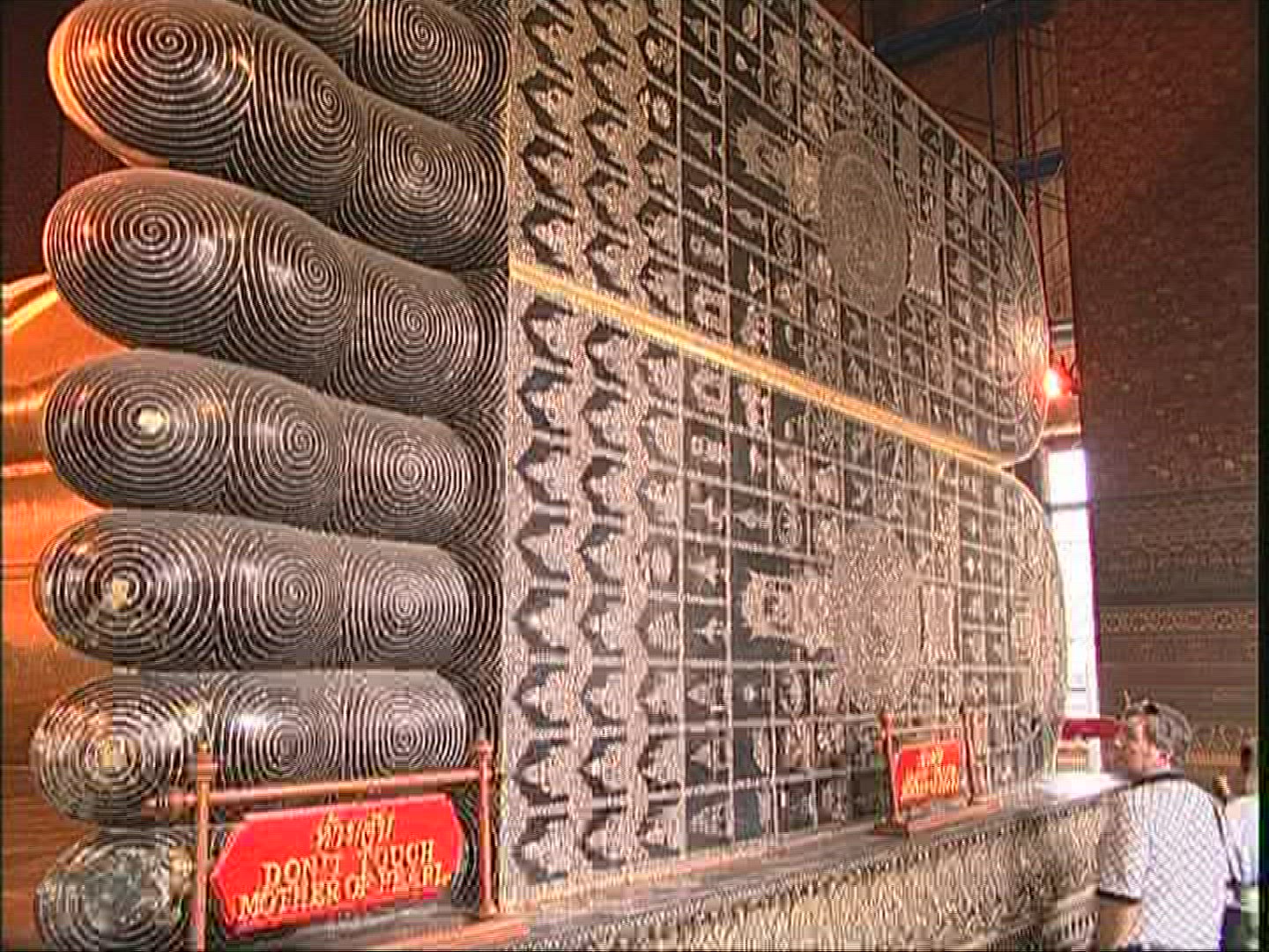 > Tourist with pad taking photo of reclining Buddha statue in Bangkok