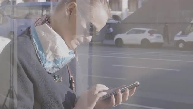 SAINT PETERSBURG, RUSSIA - MARCH 26, 2016: Young woman in sunglasses typing on smart phone at bus stop. View through the glass with people reflection