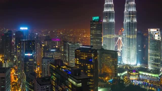 Timelapse shot of illuminated skyscrapers and Petronas Twin Towers in night Kuala Lumpur, Malaysia