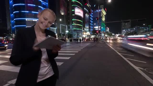 Timelapse shot of a young woman with coffee and tablet computer standing in busy crowded streets of Hong Kong