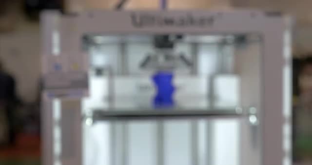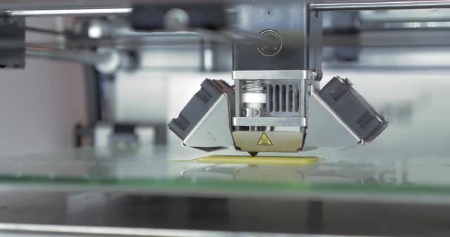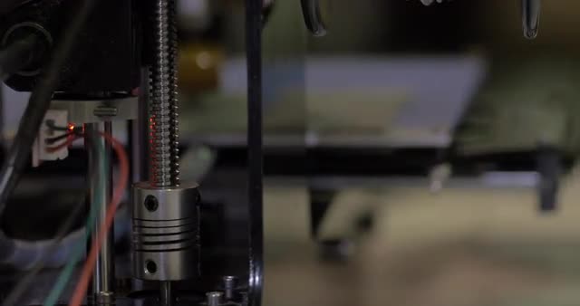 Extreme close-up view of mechanism of 3d printer in process. It makes object with white plastic