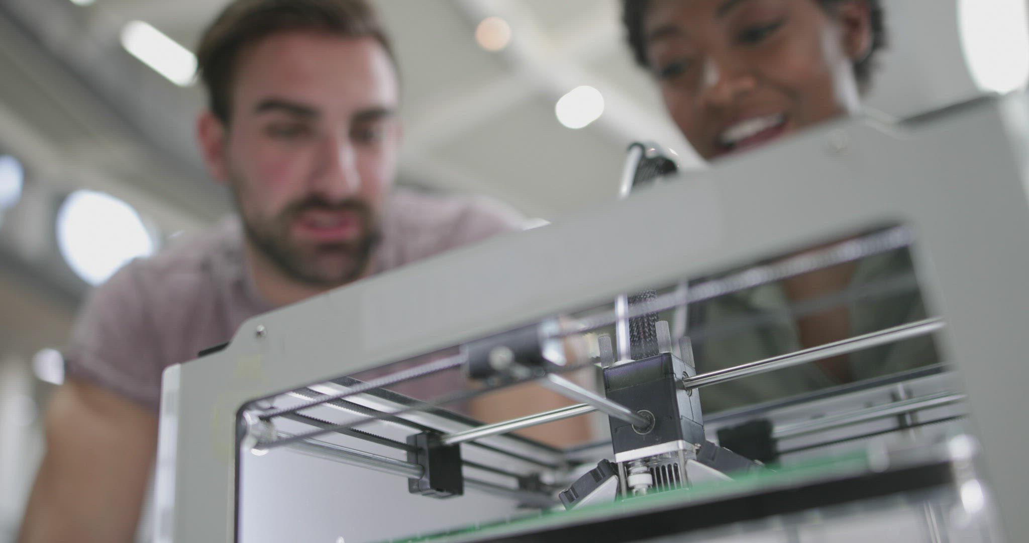 Close up view of printing plastic model on a 3D printer in process. Modern material, plastic wire filament. Advanced technology.