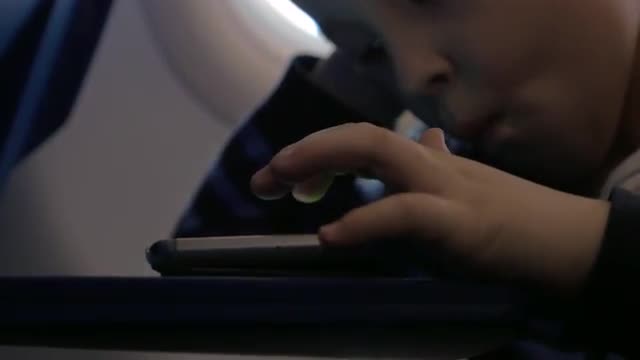Close up view of small boy playing with smartphone on the table in the airplane