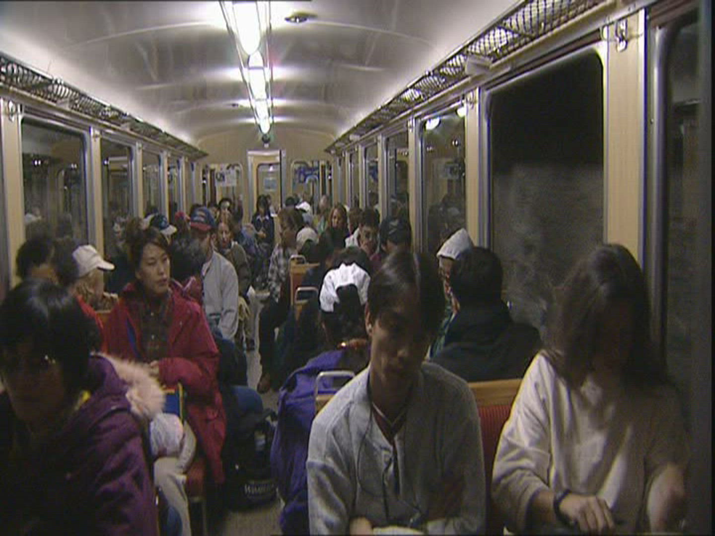 Front view of young blond woman going along train with tickets and finding her seat place, and then using tablet computer, Vienna, Austria