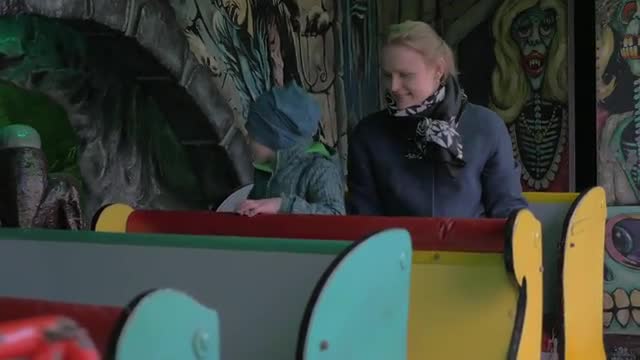 VIENNA, AUSTRIA - APRIL 26, 2016: Mother and son riding out child labyrinth on small wagon in amusement park. Austria is visited by more than 25 million tourists annually