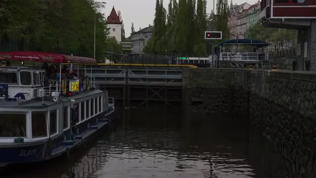 PRAGUE, CZECH REPUBLIC - APRIL 28, 2016: Timelapse shot of touristic ship coming to sluice and waiting for water drawdown