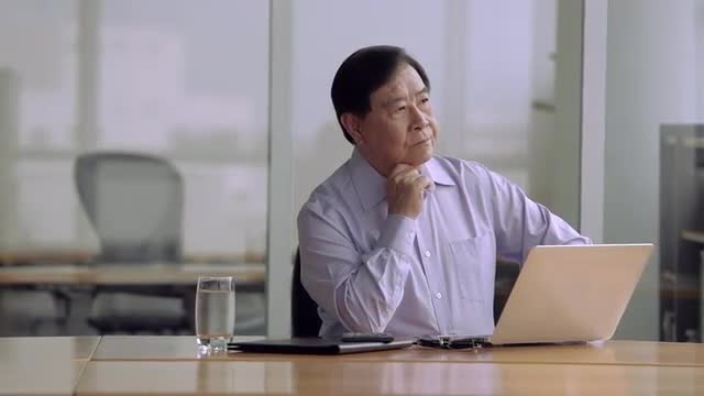 > MS Three colleagues stand at window at dusk / Singapore