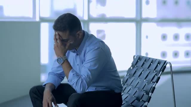 MS SELECTIVE FOCUS Seated man looks from window down to his hands / Singapore
