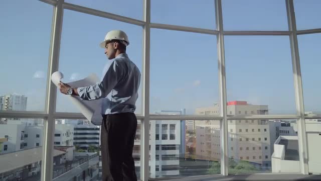 > MS SELECTIVE FOCUS Male architect stands in office with open building plans in his hands / Singapore