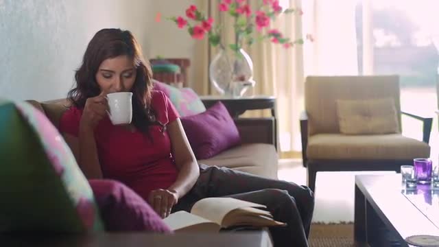 > MS SELECTIVE FOCUS Mid-adult woman drinking coffee and reading book / India
