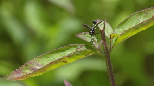 Conopid fly perched on mint leaves, takeoff HS after Hylaeus crashes into leaf