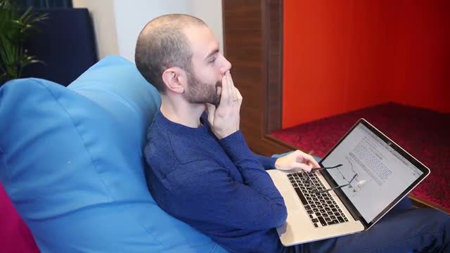 > Man with glasses working on laptop