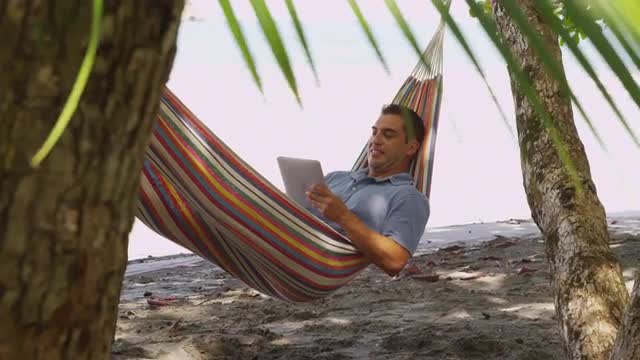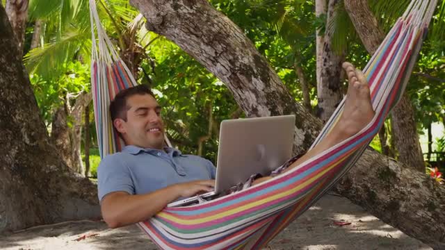 564301 - Man is Typing Fast Smiling Closes a Laptop Leans to His Arms Thinking Opens a Laptop Freelancer Prog