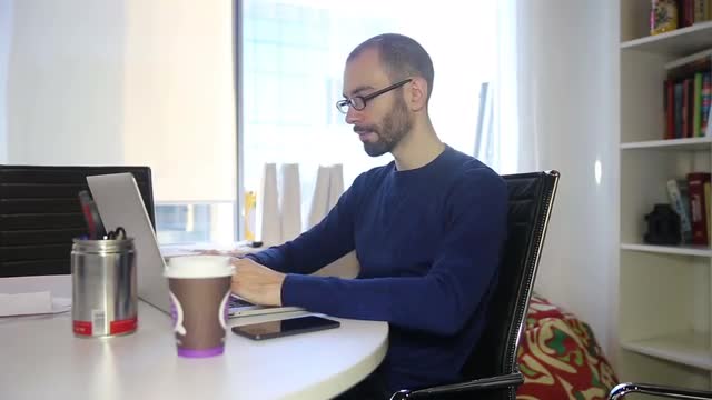 > Man with glasses working on laptop