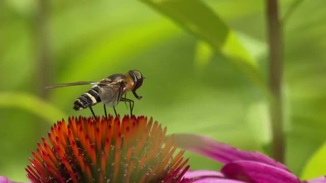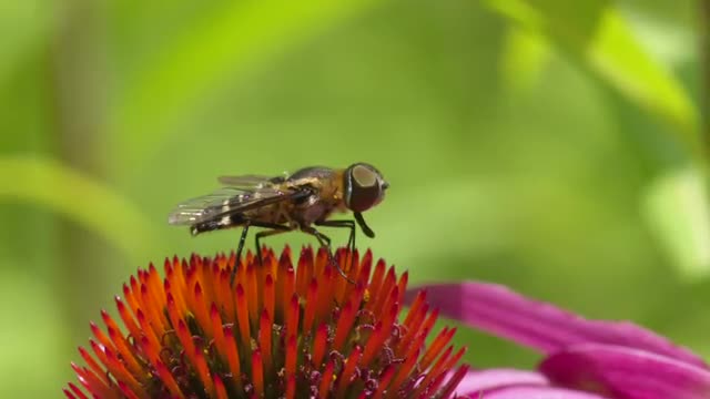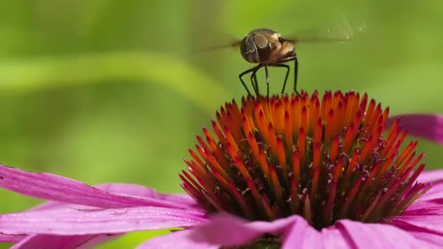 677643 - Hoverfly flaps its wings and turns on Coneflower, closeup HS