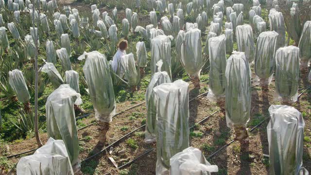 227765 - Caucasian woman in field of wrapped aloe vera plants