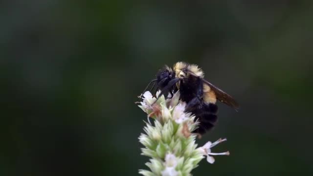 Bumble bee ambitiously foraging on pink flower, slow pan