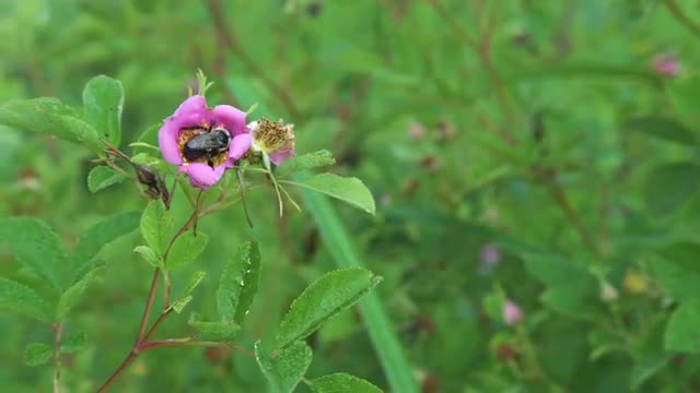 Bumble bees fighting to pollinate inside a pink swamp rose.