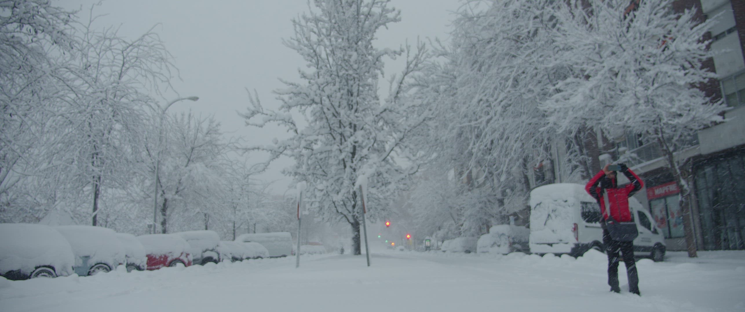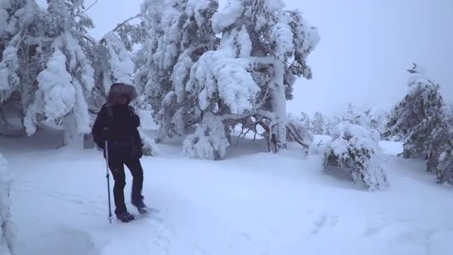 1050397 - Snow falling in front of tree covered in frost