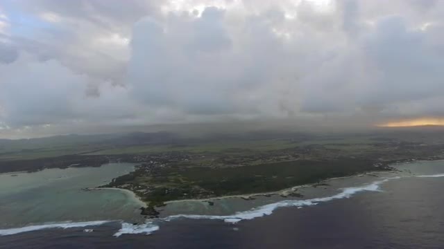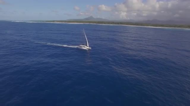 Aerial view of bay with many yachts at anchor and a motor boat sailing leaving wavy foamy trail. Mauritius Island